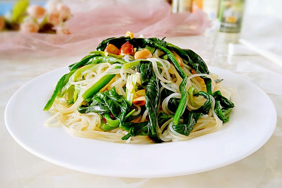 菠菜、粉丝、姜、米醋、大葱、李锦记天成一味酱油、盐、大蒜、香油、芥末油、花生碎、葱油