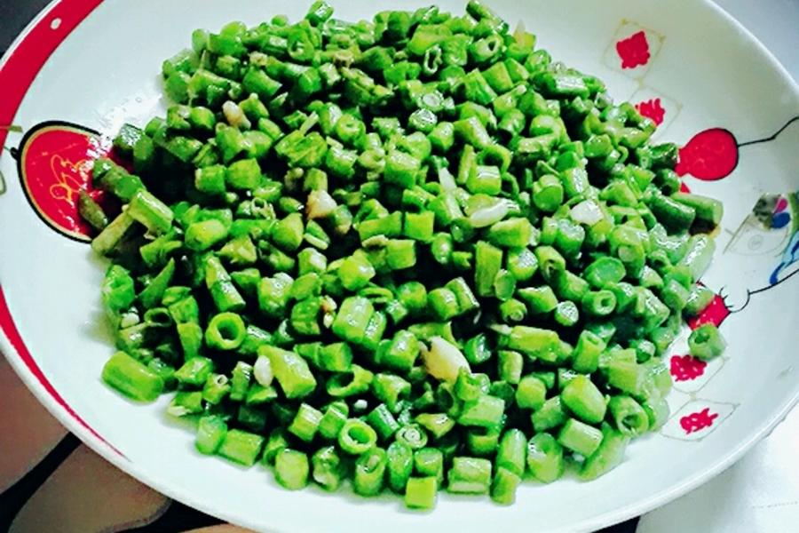 豇豆、蒜、盐、糖、色拉油、鸡精、香油、五香粉