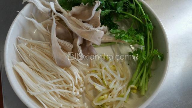 5.将金针么、鲜么、黄豆芽、香菜清洗干净后备用