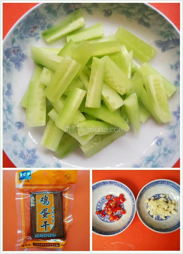 2.鸡蛋干也切成和黄瓜条一样的形状