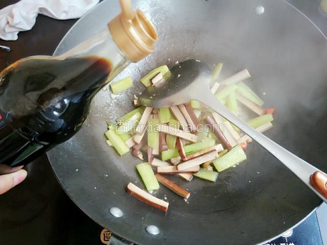 4.然后倒入鸡蛋干 加点水一起翻炒
