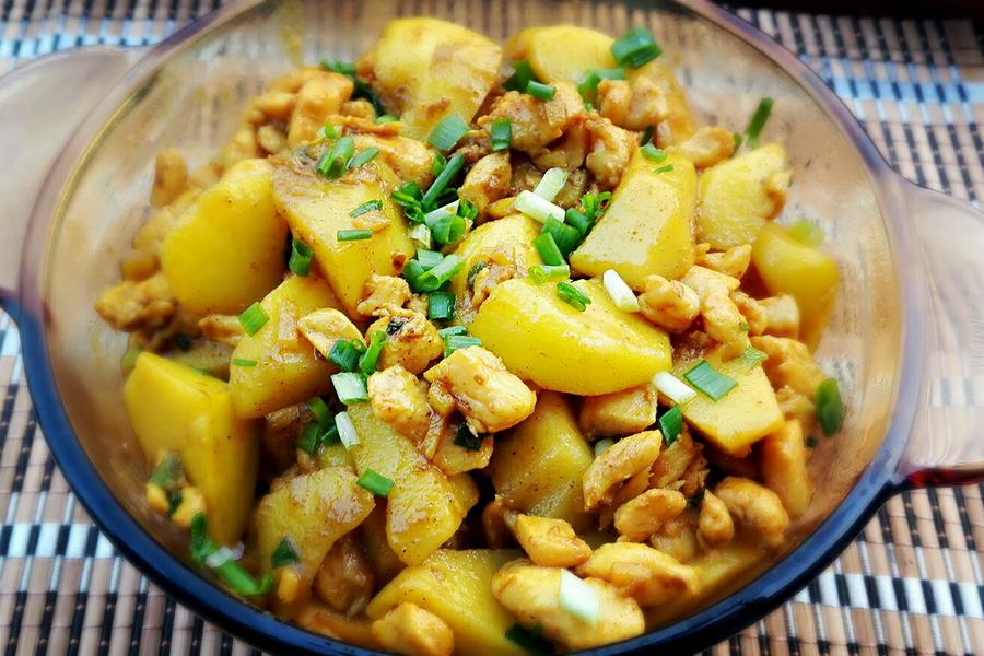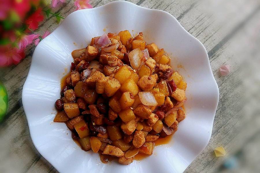 土豆、鸡胸肉、葱、料酒、盐、生抽、生粉、老抽、白糖、椒盐