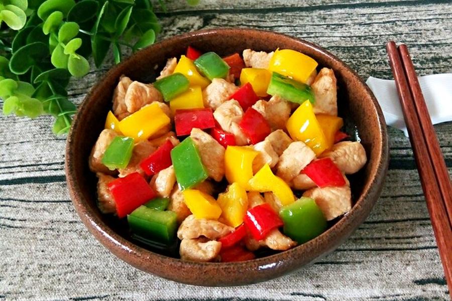红椒、鸡蛋清、青笋、鸡胸、葱、姜、蒜、料酒、盐、白糖、香油、味精、淀粉、鸡粉
