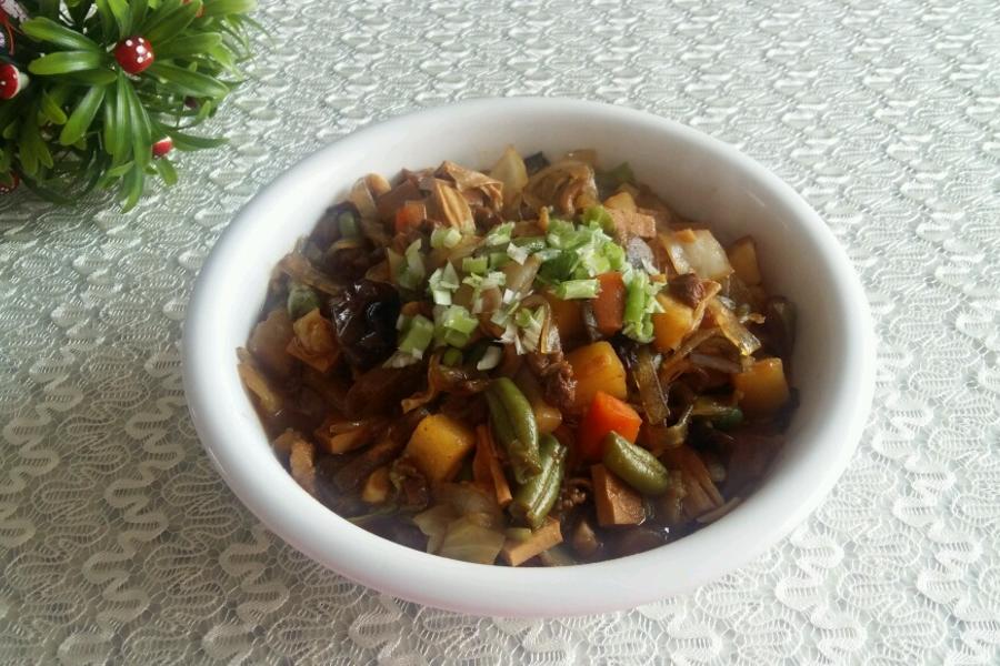 土豆、胡萝卜、豆角、茄子、粉条、肉、豆干、腐竹、莲花白、木耳
