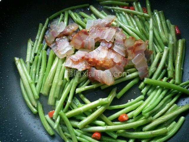 3.藜蒿摘段,韭菜切段,小米辣切小段,腊肉切薄片。