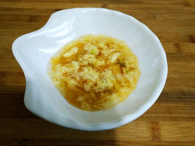 4.趁着蒸榆钱的功夫准备榆钱蒸菜的拌料,把大蒜去皮后放适量的盐,捣成蒜泥,多放一些香油待用