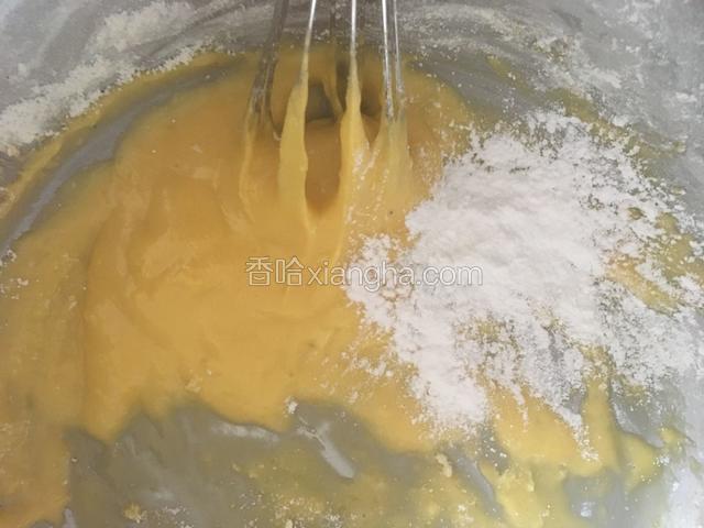 6.先把一部分蛋白霜放入蛋黄液中拌匀再把剩下蛋白霜放进去拌匀