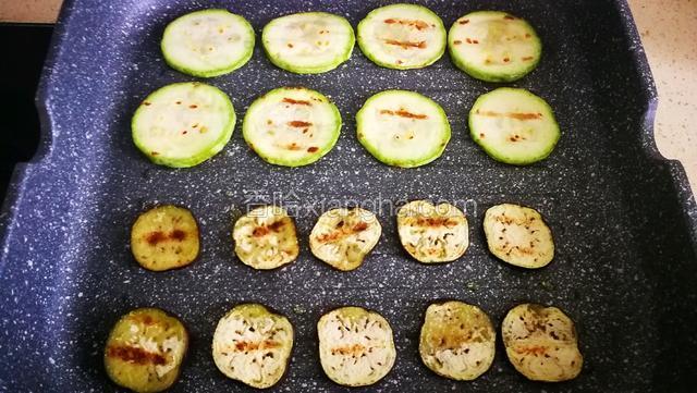 6.煮面同时煎角瓜、茄子片。 不粘锅加一勺橄榄油。