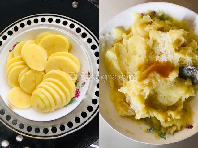 3.土豆去皮洗净上锅蒸软烂出锅,加盐、鸡汁简单调味捣烂成泥即可