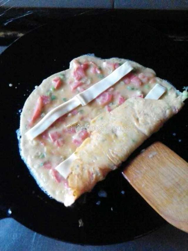 6.待一面熟了放上芝士条,从一边卷起煎熟既可