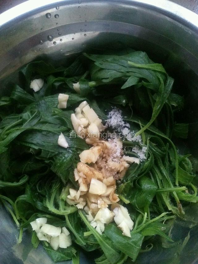 把焯过的蒲公英加蒜末,生抽,香醋,香油拌匀