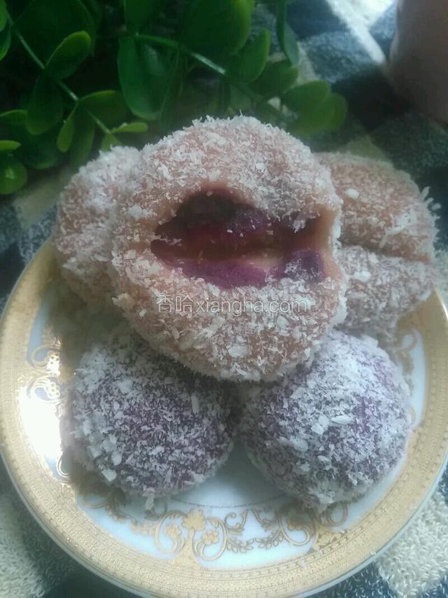 3.紫薯1个去皮蒸软,趁热加白糖炼奶拌匀压细腻就是紫薯馅了
