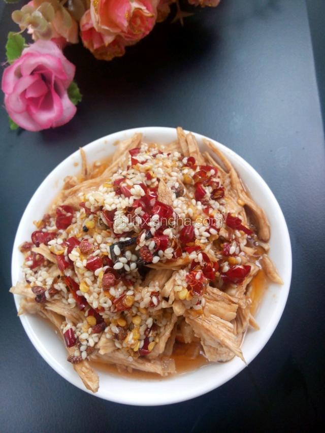 6.将烧好的油倒入辣椒白芝麻碗里,