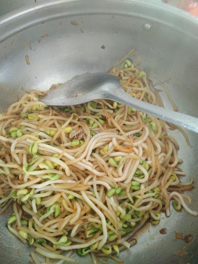 6.放入豆芽,加老抽,盐,十三香,大料沫,翻炒至豆芽变软