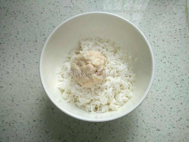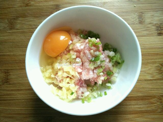 5.肉馅里磕入一个鸡蛋,放入葱白,姜粒。
