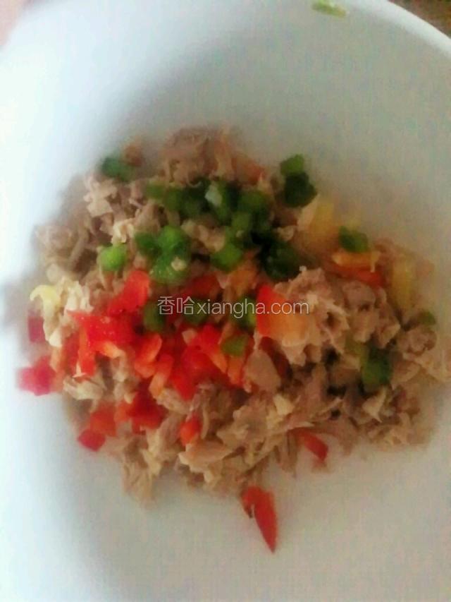 6.彩椒切成丁和鸡腿肉,加入调料拌匀,放几滴香油口感更好。