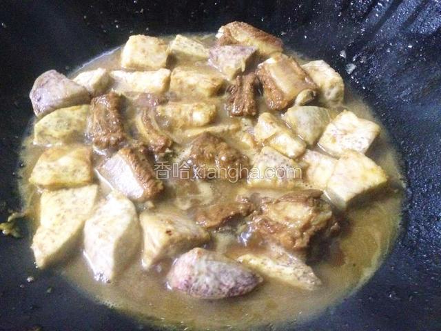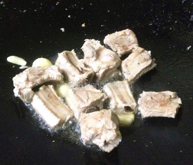 6.用煎香芋留下的油把排骨煎至表面微黄.下蒜头炒香.