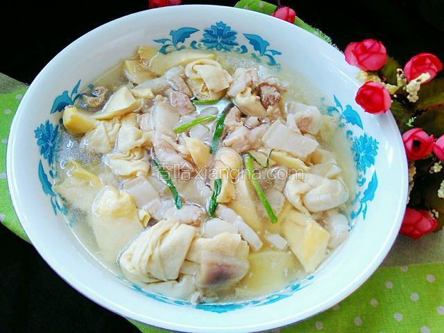 4.咸肉、鲜肉,分别加姜片焯水,然后改刀切成小块。冬笋放在锅里煮烂,一般水开后再煮半小时,这样即可去除苦味涩味,然后切成滚刀块。百叶结可用热水烫一下去除豆腥味。(这个可以省略)