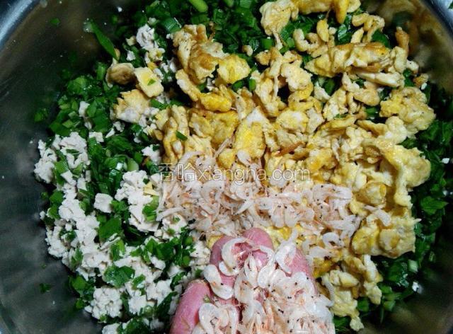 5.将韭菜豆腐放到一个大的容器里,再放入炒好的鸡蛋碎和虾皮子。