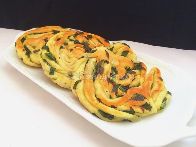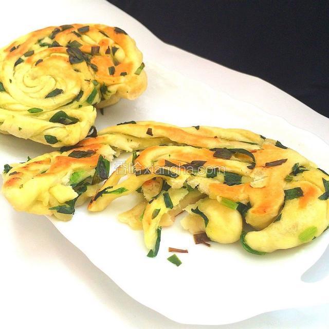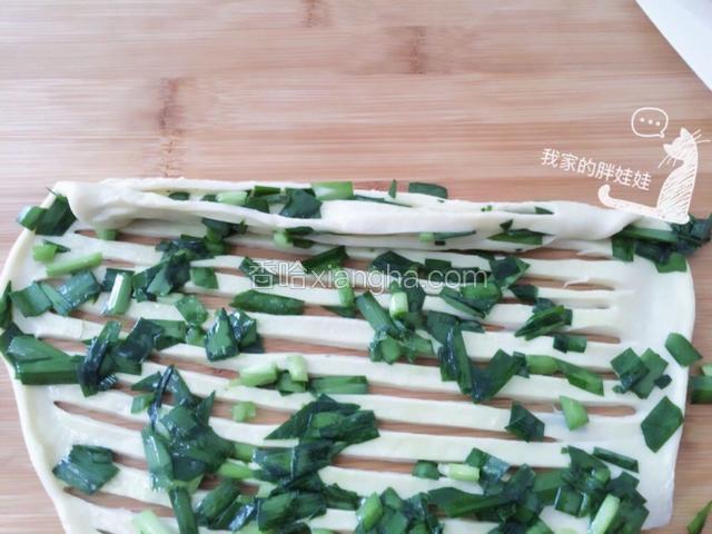 6.用刀在面上划出道道,两头不要划开,然后抹上韭菜