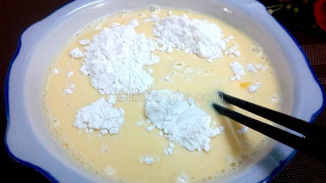 2.鸡蛋打散,加入牛奶调和均匀。加入糯米粉,搅拌均匀。