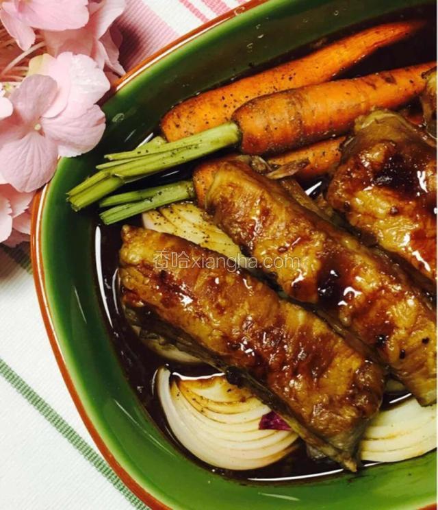 4.将腌好的肋排取出,平铺于准备好的蔬菜中