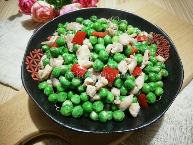 6.下焯好的豌豆粒一起炒匀,调入适量盐