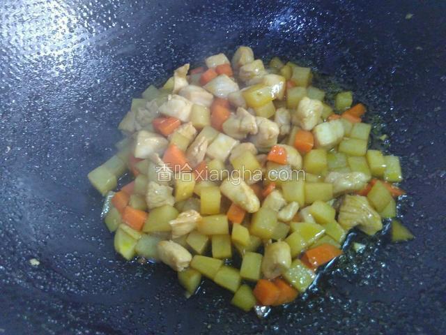 1.土豆去皮洗净切丁泡水,胡萝卜洗净切丁,鸡丁洗净