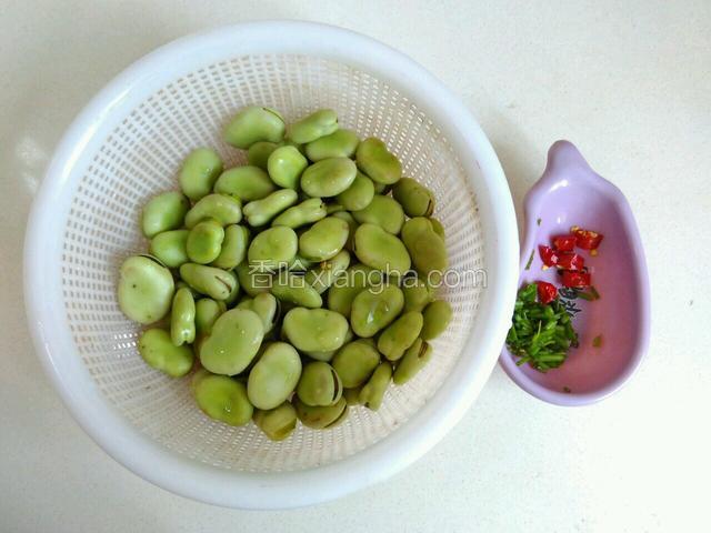 1.蚕豆洗净,葱洗净切末,小米椒洗净切碎