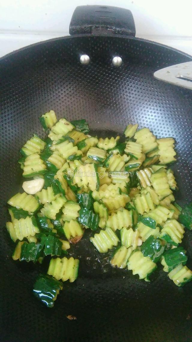 2.蒜切片,姜切片,黄瓜用擦板切成1.5厘米的小段。