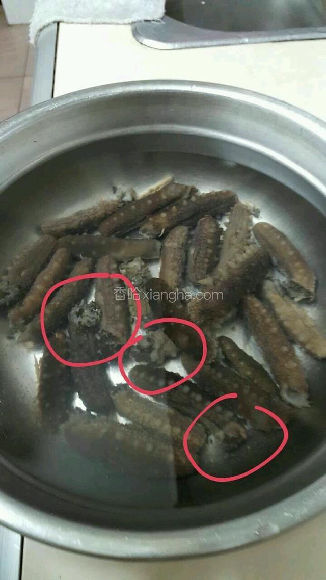2.泡发24小时后,清理海参,图中画圈的部位就是沙嘴。
