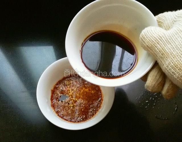 6.煸香以后把料捞出,把油晾至六七层热时浇到辣椒碗中。