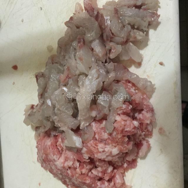 4.剁碎的五花肉与鱼肉,已经很均匀了。