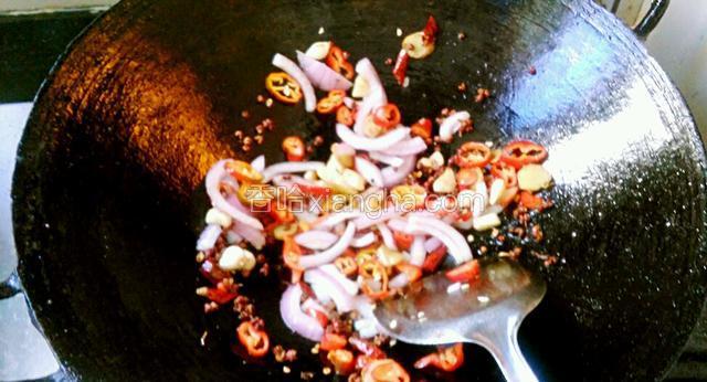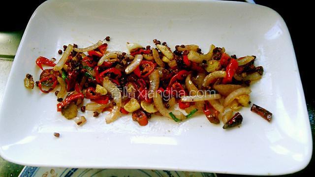 3.花椒装盘,干红辣椒剪段,大蒜切块,生姜切片,红辣椒切圈,洋葱小香葱切段。