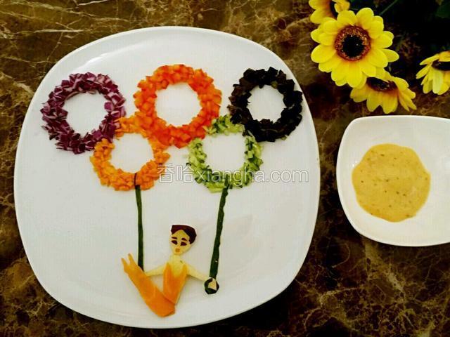 6.苹果刻皮肤,茄子皮刻头发眼睛,胡萝卜是衣服,这样就完整了~再把沙拉酱也摆好~开吃吧~