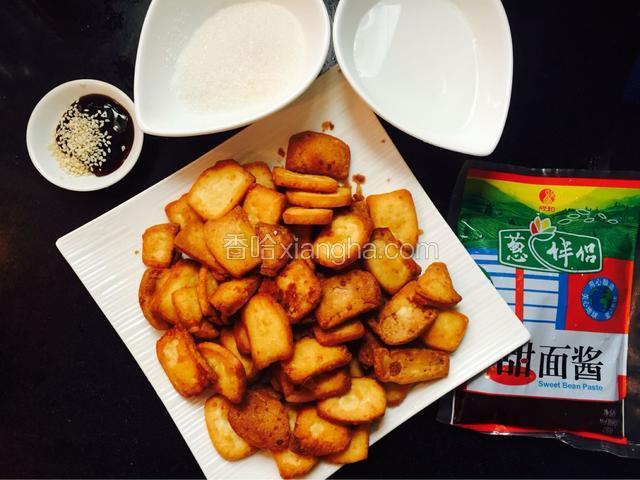 1.准备所需食材,年糕,和白糖,耗油,白芝麻,凉白开和甜面酱,这个图片是油炸好的年糕