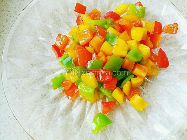 5.锅中加少许油把青红黄椒炒至略通明状出锅