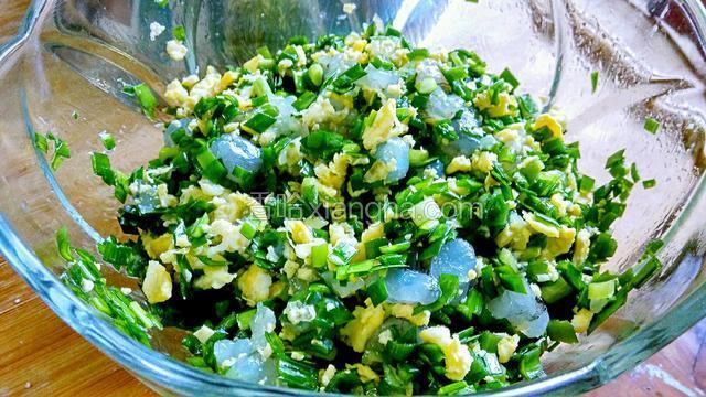 5.把虾仁、鸡蛋、韭菜一起放到碗里,加入盐、油、香油调味。
