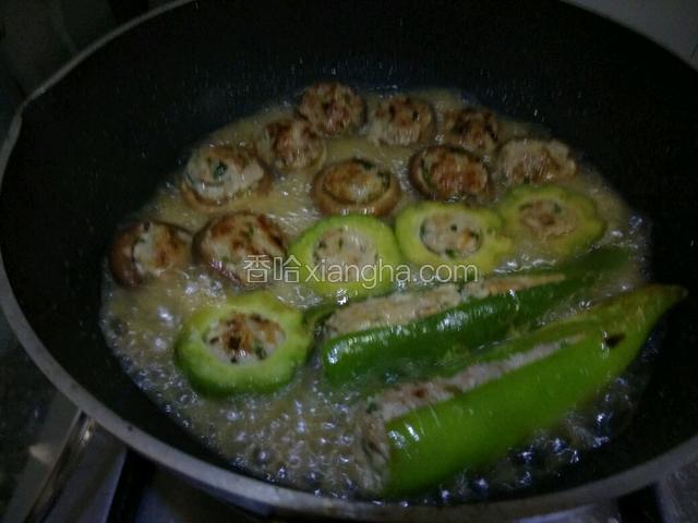 4.热油锅放酿香菇,酿苦瓜,酿辣椒,有酿肉的一面朝下,入锅煎