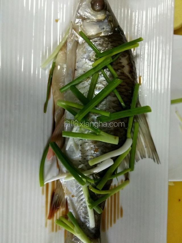 6.把蒸熟的鱼去掉姜丝,淋上蒸鱼豉油,撒上葱段,浇上滚油(为了效果图我蒸熟换了碟子,自己家里不用这么麻烦的)