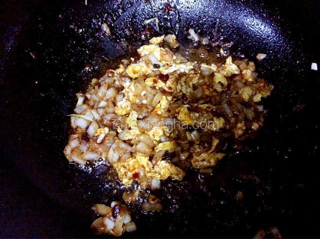6.用炒鸡蛋剩下的油,继续烧热,放入元葱,加花椒粉炒出香味