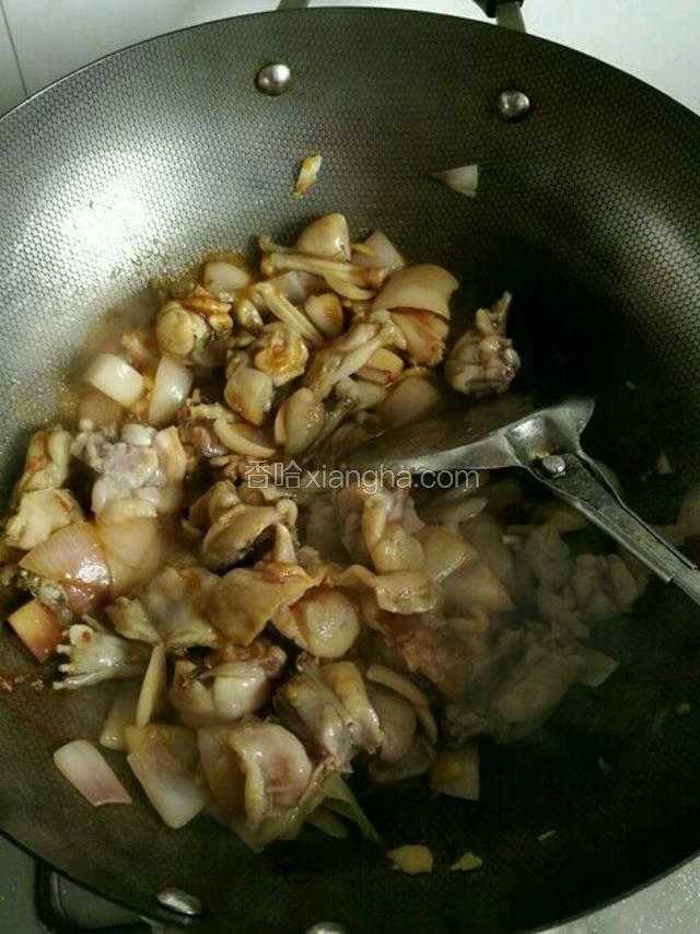 4.油锅内的油七成热放葱姜蒜末炒香,把牛蛙块儿倒入锅中,放料酒,盐和蚝油翻炒片刻