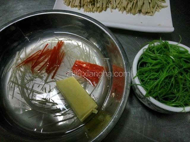4.姜,红椒切细丝。