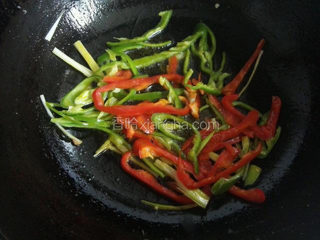 6.用用底油爆香青红椒和葱丝