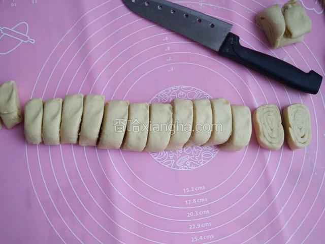 6.卷起后用手把长条两头切掉,然后稍微用手掌心按扁用刀切成图中的样子。