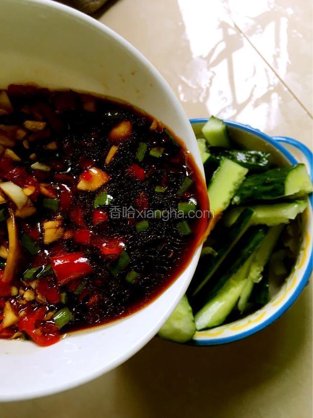 6.准备好一个干净的碗,放入蒜头葱花生抽醋香油和适量盐调味