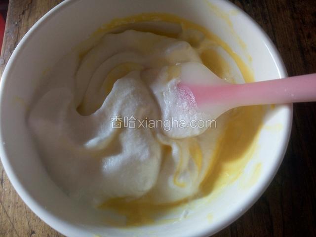 5.再将刚刚混合好的蛋黄糊加入到三分之二的蛋白霜里,同样采用翻拌手法
