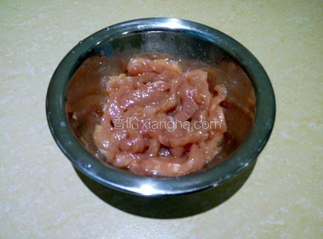 3.猪肉切细长条,用盐、白糖、生抽、生粉和油抓一抓,腌10分钟。