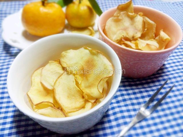 6.烤好的苹果片。不过刚刚烤好的苹果片比较软,过几分钟就会变脆