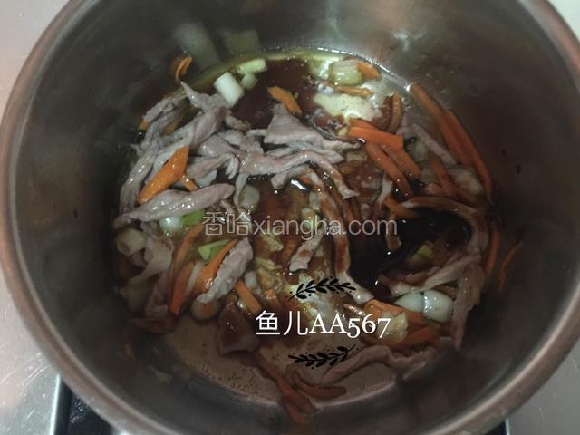 6.炒锅放油,放入葱末,肉丝、胡萝卜丝翻炒片刻。